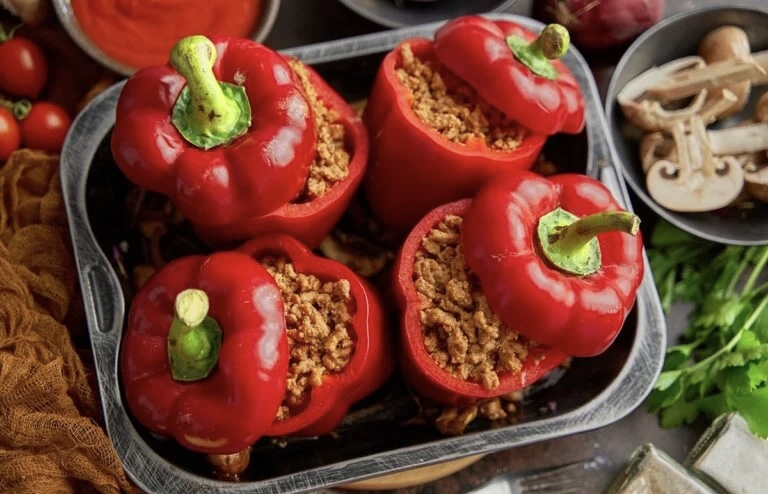 Estos pimentones rellenos de pavo lo haremos con los vegetales rojos, ya que es uno de los más dulces y suaves al paladar cuando están cocidos. Además, estarán rellenos de un rico pavo molido salteado con especias, ajo y cebolla. Una vez listos, lo gratinaremos con un poco de queso para darle una mejor textura.