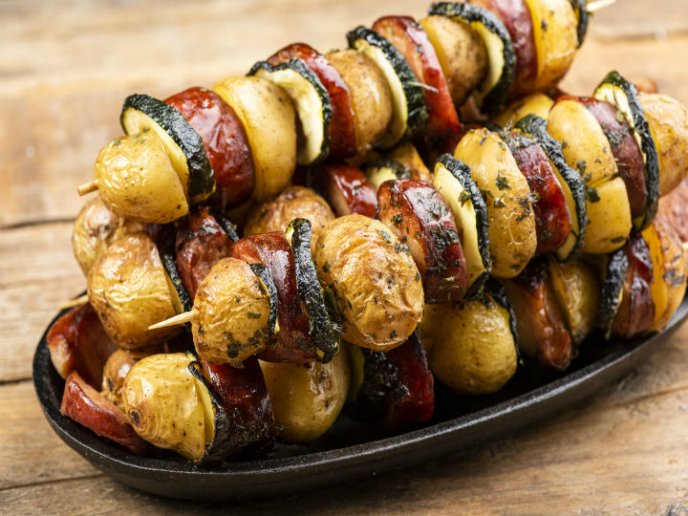 4. Para formar las brochetas, inserta una mitad de papa, seguida por una rebanada de chorizo y luego una rebanada de zuchinni. Repite hasta llenar la brocheta.