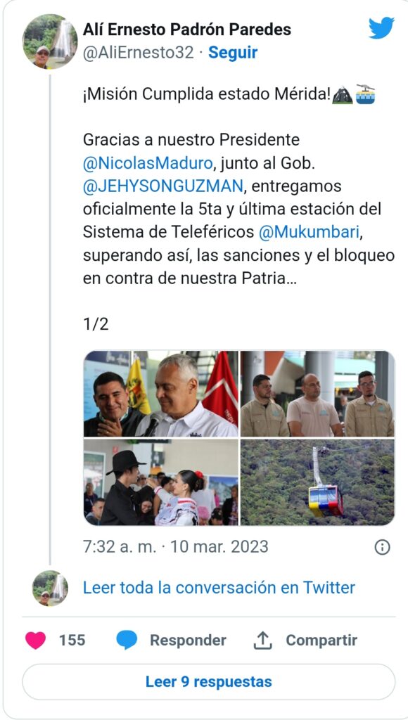 El ministro del Poder Popular para el Turismo, Alí Padrón, en compañía del gobernador de Mérida, Jehyson Guzmán, y el presidente de Venezolana de Teleféricos (Ventel), Víctor Cruz, lideraron la puesta en funcionamiento de la 5ta estación Pico Espejo del Sistema de Teleféricos Mukumbarí, “superando así las sanciones y el bloqueo en contra de la Patria”.
