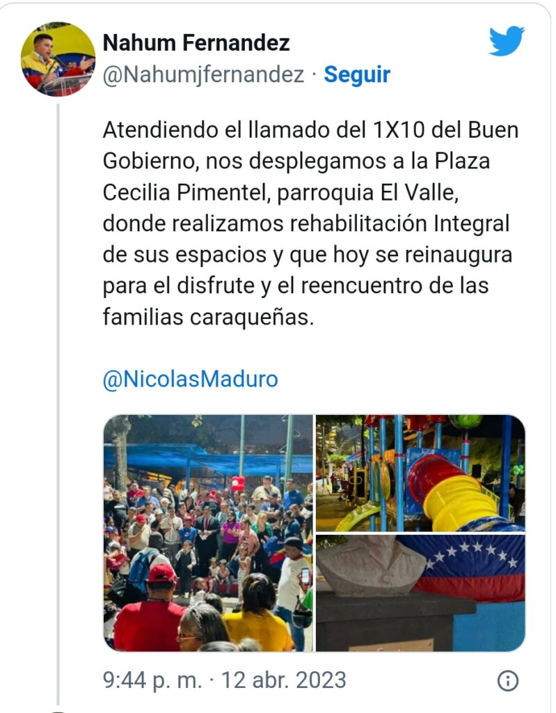 La información la dio a conocer Fernández a través de sus redes sociales, donde recalcó que “atendiendo el llamado del 1×10 del Buen Gobierno, acudieron a la Plaza Cecilia Pimentel, parroquia El Valle para efectuar la rehabilitación integral de sus espacios “para el disfrute y el reencuentro de las familias caraqueñas”, dijo.