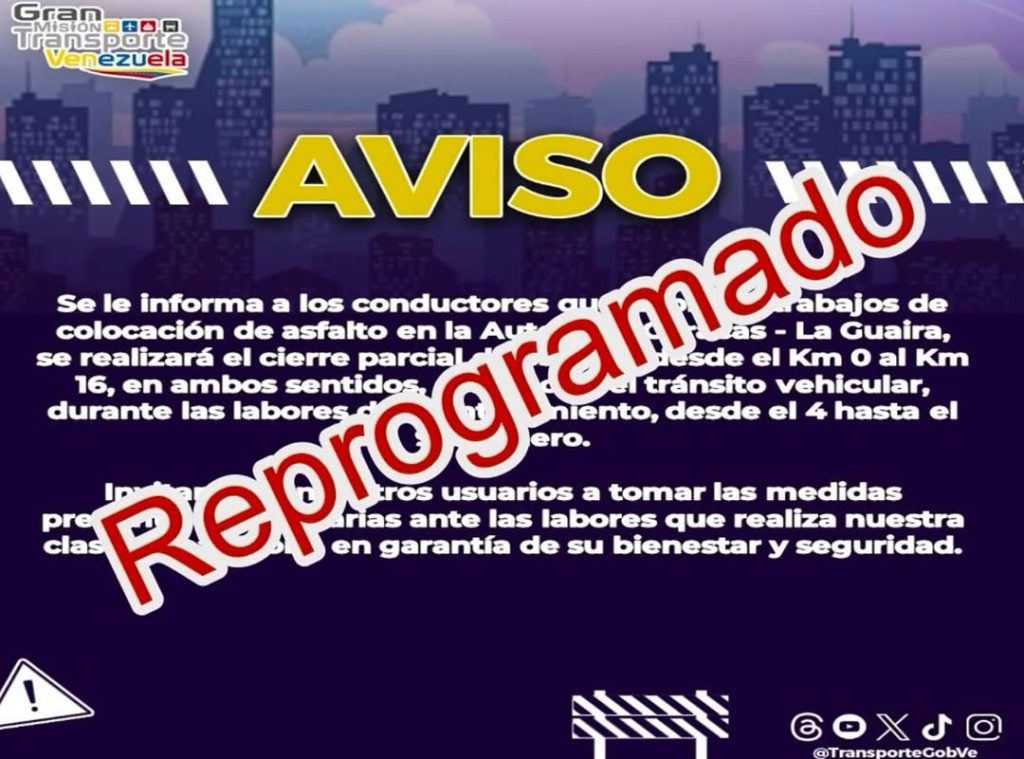 El Ministerio de Transporte informó a través de su cuenta en la red social Instagram que la autopista Caracas – La Guaira estará cerrada parcialmente desde este 13 al 18 de enero, debido a labores de asfaltado que se realizarán desde el Kilómetro 0 hasta el 16.
