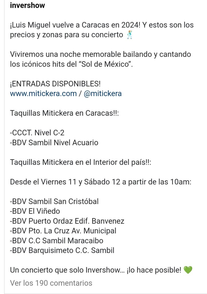 La empresa venezolana dedicada a la producción de espectáculos y eventos musicales, Invershow, publicó la mañana de este viernes 11 de agosto los precios para las entradas del concierto del artista mexicano Luis Miguel, quien se presentará en el Estadio Monumental Simón Bolívar el 12 de febrero de 2024.