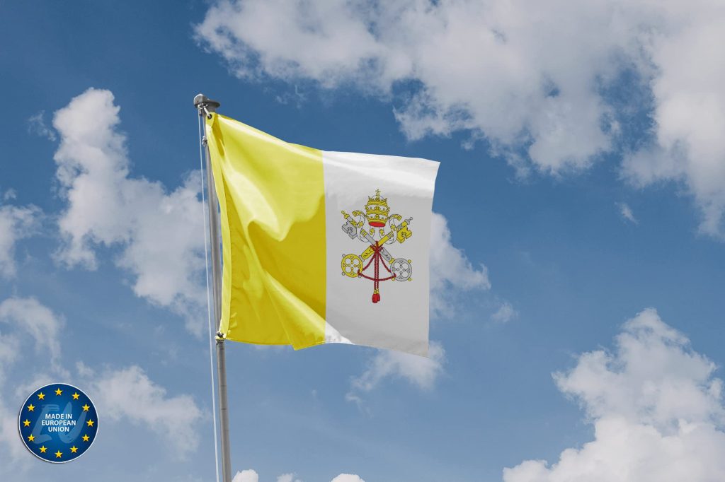 Por su parte, la bandera del Vaticano, con su diseño dividido en dos franjas verticales, una dorada y otra blanca junto con el escudo con las llaves de San Pedro, refleja la identidad de la sede de la Iglesia Católica. También mantiene la proporción cuadrada, reforzando su carácter único entre las banderas del mundo.