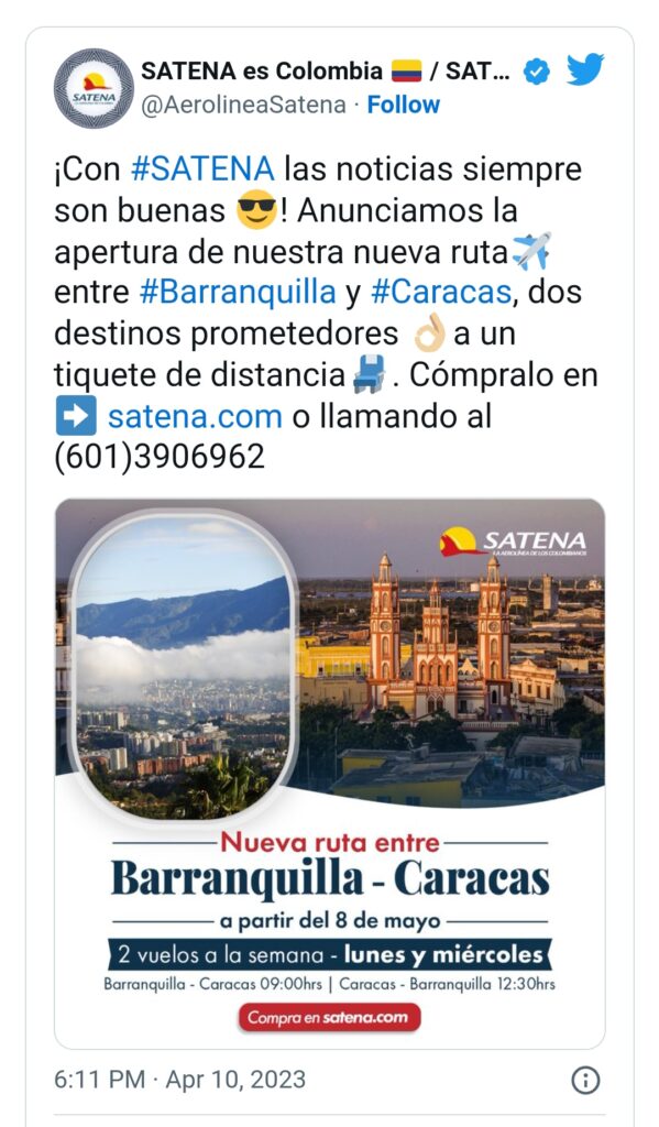 El anunció lo hizo la aerolínea neogranadina a través de su cuenta en la red social Twitter, donde indica que la periodicidad de la nueva ruta será dos veces a la semana; los días lunes y miércoles.