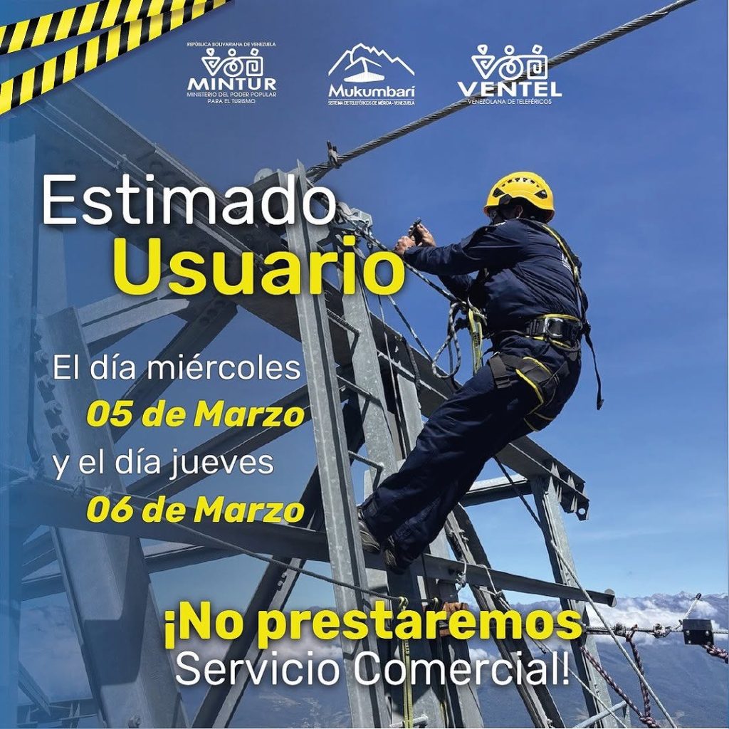 En una reciente publicación en su cuenta de instagram, el Sistema de Teleféricos Mukumbarí informó que no estará prestando servicio comercial los días miércoles 05 y jueves 06 de marzo.