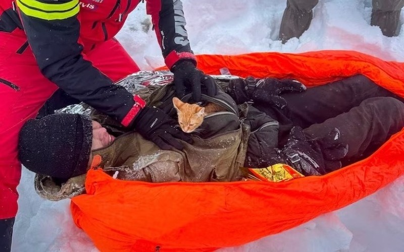 Cuando el equipo lo localizó, le abrieron la chaqueta y descubrieron al pequeño gato naranja acurrucado adentro.