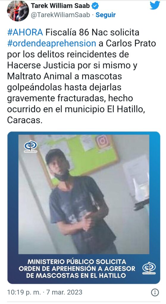 El fiscal general de la república, Tarek William Saab, informó a través de Twitter que la fiscalía 86 solicita orden de aprehensión al ciudadano Carlos Prato, por «delitos reincidentes de Hacerse Justicia por si mismo y Maltrato Animal a mascotas».