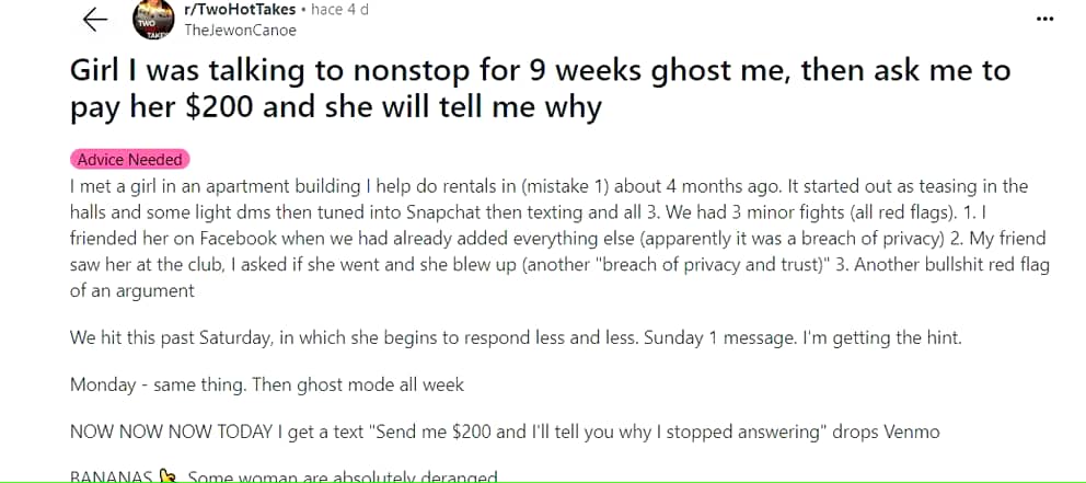 El distanciamiento se hizo evidente y la comunicación se volvió cada vez más escasa, hasta que finalmente recibió un mensaje de texto en el que ella le pedía dinero para explicarle el motivo de su desaparición. “Hoy, recibo un mensaje de texto: ´Envíame 200 dólares y te diré por qué dejé de responder´”, escribió el hombre.