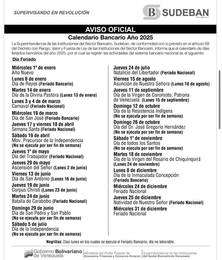 De acuerdo con el calendario publicado por Sudeban los próximos feriados bancarios: