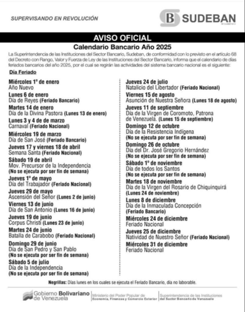 La Superintendencia de las Instituciones del Sector Bancario de Venezuela (SUDEBAN), organismo gubernamental encargado de supervisar y regular el sector financiero del país, establece los feriados bancarios para el mes de agosto del año 2025.