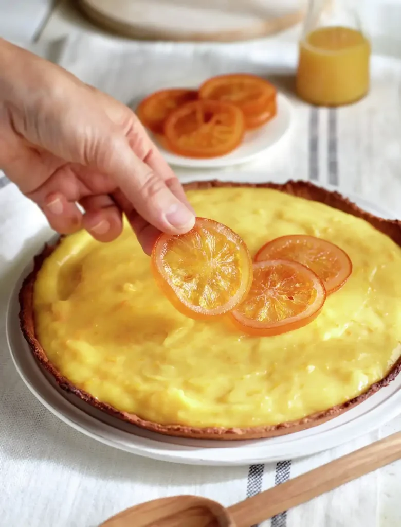 Lo interesante de esta receta está en el contraste. Por un lado, la base de masa brisa aporta ese toque crujiente que siempre apetece; por otro, la crema de naranja es suave, ligeramente ácida y muy aromática. El resultado es un equilibrio que no empalaga y que deja con ganas de repetir. Además, el detalle de las naranjas confitadas en la superficie no es solo decorativo. Aporta un punto más intenso de sabor y una textura que rompe con la cremosidad del relleno. Es ese tipo de remate que hace que el conjunto pase de estar bien a ser realmente memorable.