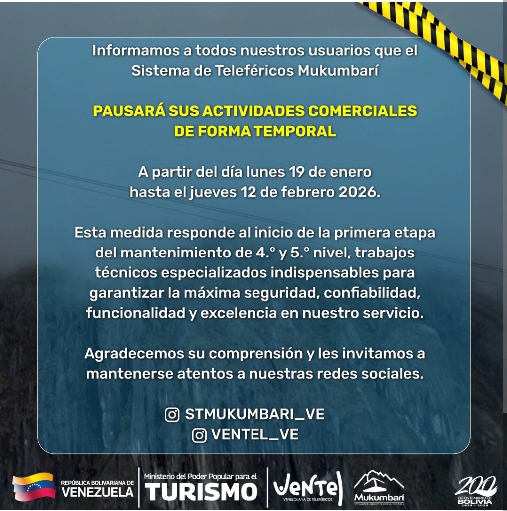 Entre el lunes 19 de enero y hasta el jueves 12 de febrero de 2026 el El Sistema Teleférico Mukumbarí, en el estado Mérida, realizará una pausa temporal en sus actividades.