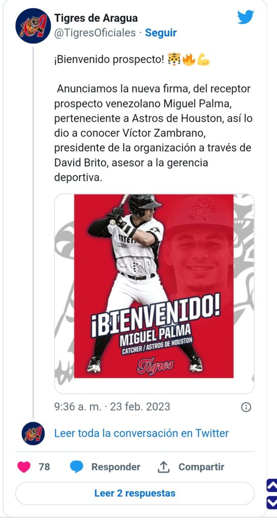 Los Tigres de Aragua anunciaron este jueves, la firma de Miguel Palma, receptor prospecto que pertenece en Estados Unidos a los Astros de Houston. El joven venezolano tiene tres temporadas en Ligas Menores.