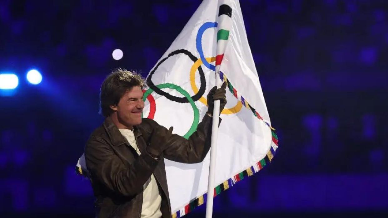 Cruise se lanzó desde el techo del estadio para tomar la bandera en representación de Los Ángeles 2028, la próxima edición de las olimpiadas. De acuerdo a varios videos, lo hizo con un arnés y ya cuando aterrizó, caminó entre los atletas que le hacían un pasillo, luego tomó el banderín blanco de la mano de la gimnasta Simone Biles y luego continuó su rumbo.