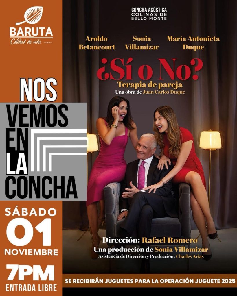 El próximo sábado 1 de noviembre, la Concha Acústica de Bello Monte se transformará en un consultorio lleno de humor con la presentación gratuita de la exitosa comedia “¿Sí o No? Terapia de Pareja”. La obra, que ha conquistado escenarios dentro y fuera del país, llega como parte del programa cultural “Nos Vemos En La Concha”, impulsado por la Alcaldía de Baruta para promover el arte, la cultura y el entretenimiento familiar.