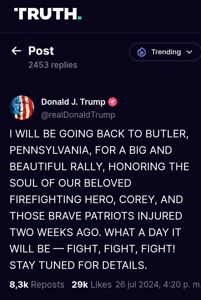 «Volveré a Butler, Pensilvania, para un gran y hermoso mitin en honor al alma de nuestro querido héroe bombero, Corey, y de esos valientes patriotas hëridos hace dos semanas», escribió Trump en su red social Truth.