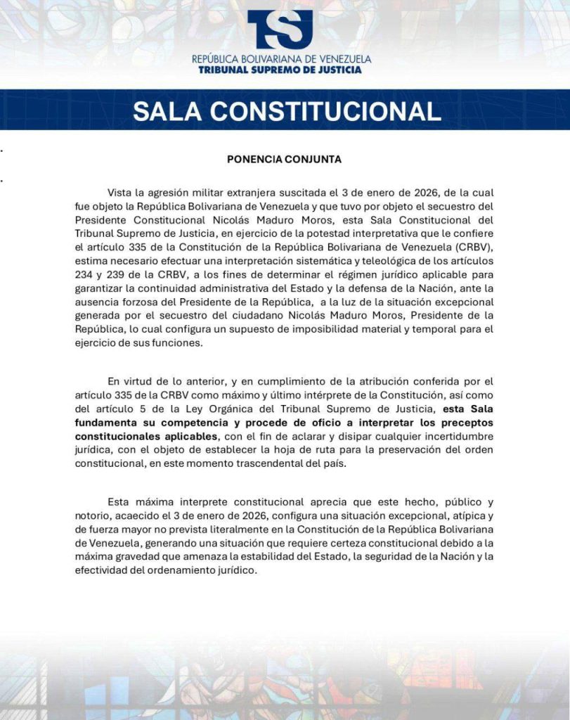 El fällo se fundamenta en una «situación excepcional, atípica y de fuërza mayor» dërivada de una agrësión militär extranjera ocurrida el mismo 3 de enero, que habría tenido como objeto el secuëstro del Presidente constitucional. Ante este escenario, que el TSJ califica como una «impøsibilidad material y temporal» para el ejercicio de las funciones presidenciales, la Sala interpretó sistemáticamente los artículos 234, 239.6, 335 y 336.10 de la Constitución (CRBV) para establecer la hoja de ruta legal y disipar cualquier incertidumbre jurídica.