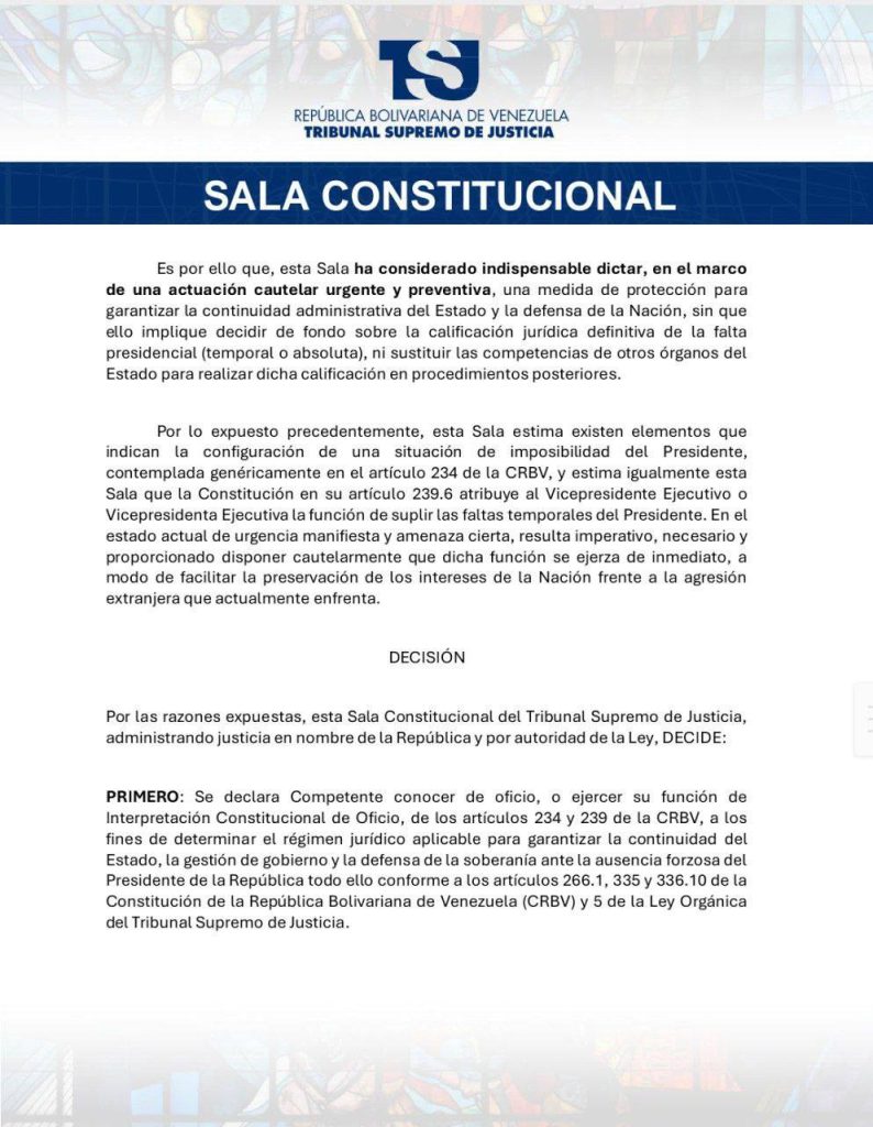 La Sala Constitucional del Tribunal Supremo de Justicia (TSJ), dictó una medida caütelar urgënte y preventiva para que la vicepresidenta Ejecutiva, Delcy Eloína Rodríguez Gómez, asuma y ejerza en condición de presienta temporal con todas las atribuciones y facultades inherentes al cargo de Presidente de la República. Esta decisión, emitida el 03 de enero de 2026, busca garantizar la continuidad administrativa del Estado y la defensa integral de la nación ante la «ausëncia foøzosa» del presidente, Nicolás Maduro Moros.