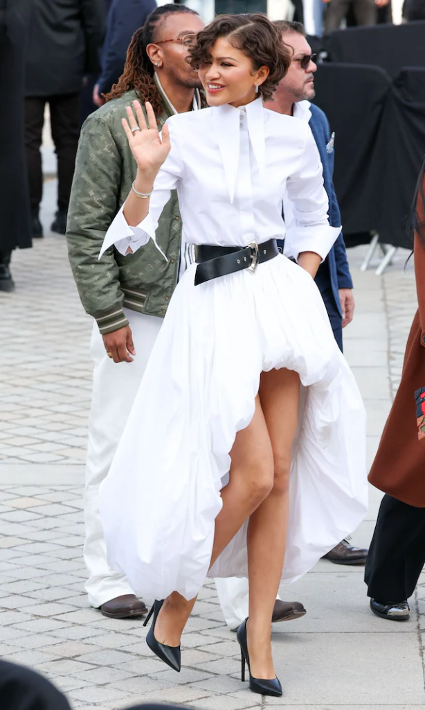 Zendaya deslumbró con un conjunto compuesto por una camisa blanca de cuello dramático y una audaz falda «bubble» de corte high-low, una silueta compleja que la actriz lució con su característica sofisticación. La elección del atuendo, que equilibra la vanguardia de la alta costura con una elegancia nupcial modernizada, se convirtió rápidamente en el tema principal de conversación en plataformas digitales, donde el término «perfección» fue la constante entre sus seguidores.