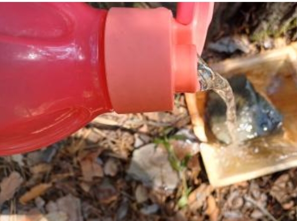 Deja los cubos con agua y de vez en cuando vuelve para rellenarlos. Sale con una garrafa de 5 litros en la mochila con la que llena cantimploras y con ellas reparte el agua entre los cubos previamente colocados: “Cubro un sector cercano, claro, yo no puedo abarcar toda la montaña, evidentemente.”