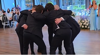 La coreografía recreó de manera divertida y detallada la previa de un partido de fútbol profesional. El grupo de hombres simuló el saludo protocolario, chocando las manos con el equipo rival, que en este caso estaba representado por las damas de honor de la novia. Posteriormente, simularon una sesión de calentamiento deportivo, con movimientos coordinados que desataron risas y aplausos.