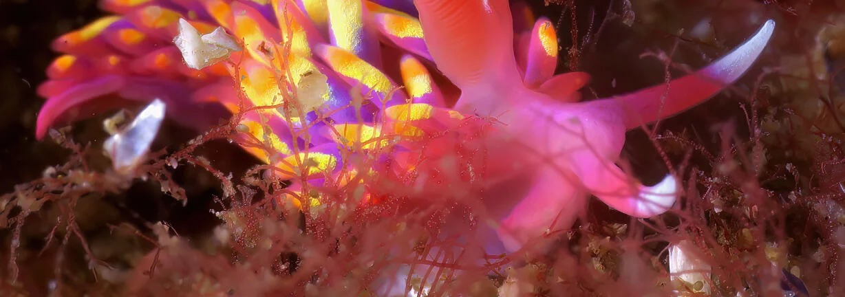 La ‘babakina anadoni’, más conocida como la babosa de mar arcoíris, es una especie perteneciente a la familia de los nudibranquios eólidos cuyo tamaño apenas alcanza los dos centímetros de largo. Su nombre significa «branquia desnuda» y hace referencia al aparato respiratorio del exterior de sus cuerpos blandos, alargados y transparentes. Estas especies casi fantásticas resultan especialmente llamativas por los colores tan fosforitos que cubren la superficie de su cuerpo. Los contrastes entre los tonos rosados, azules, amarillos, naranjas, morados y blancos le dan a esta tipo de babosa un aspecto inusual y brillante que no pasa inadvertido.