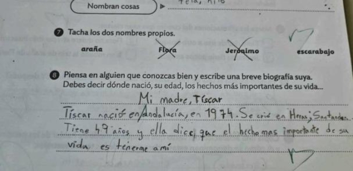 Así lo ha demostrado Tíscar, una madre que se ha hecho viral con la emocionante respuesta de su hija a una pregunta de un examen del colegio. Unas palabras que la pequeña dedica a su madre en el ejercicio.