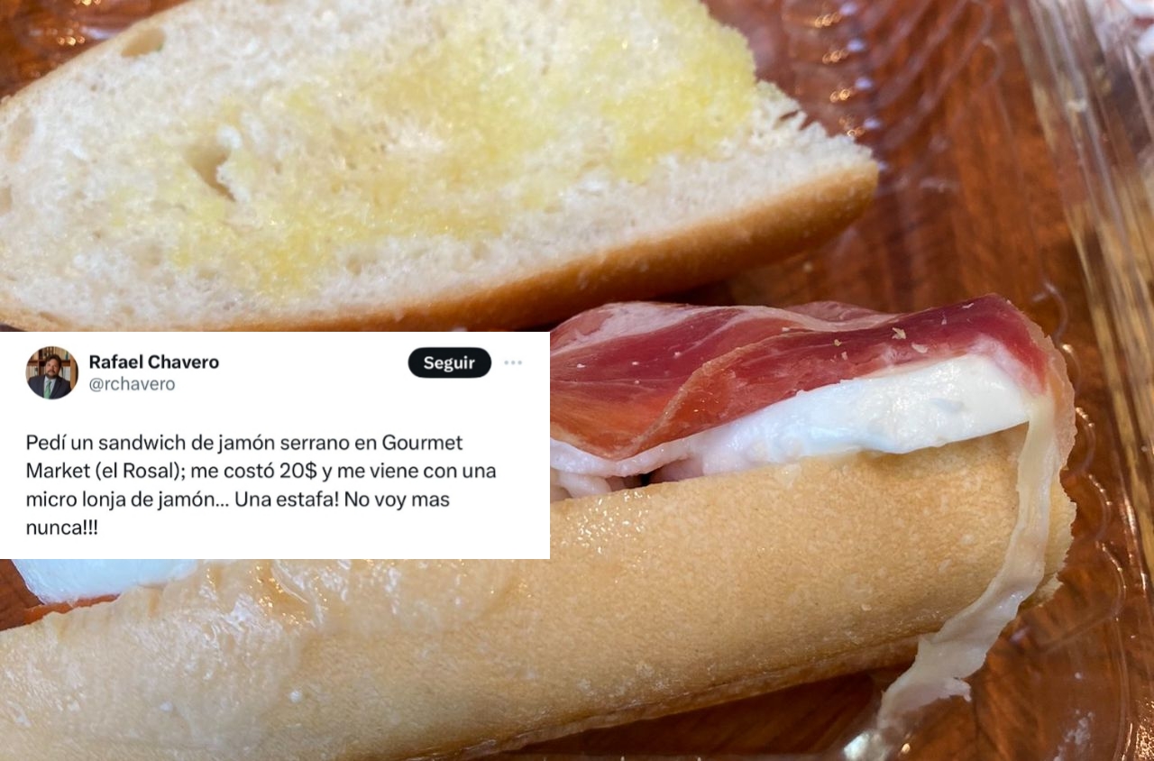 «Pedí un sandwich de jamón serrano en Gourmet Market (el Rosal); me costó 20$ y me viene con una micro lonja de jamón… ¡Una estafa! No voy mas nunca», se lee en el mensaje difundido por el denunciante.