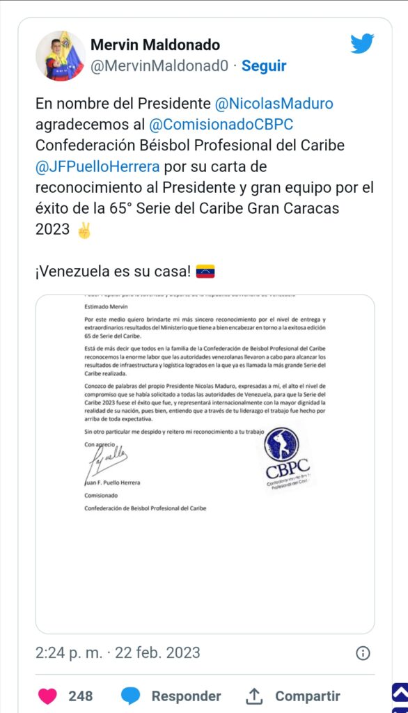 A través de la red social Twitter, @MervinMaldonad0, escribió: “agradecemos al comisionado de la Confederación Béisbol Profesional del Caribe por su carta de reconocimiento al gran equipo por el éxito de la 65° Serie del Caribe Gran Caracas 2023.