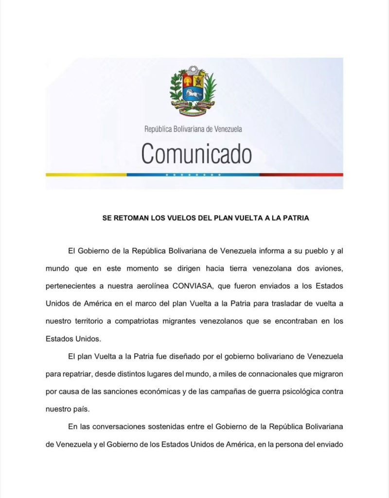 A través de un comunicado, el Ministerio de Comunicación indicó que los dos aviones de la aerolínea estatal Conviasa viajaron hasta Estados Unidos, como parte del ‘Plan Vuelta a la Patria’, para trasladar de regreso a Venezuela a «compatriotas migrantes» que se encontraban en la nación norteamericana.