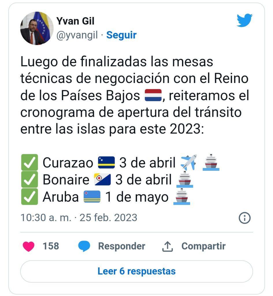«Luego de finalizadas las mesas técnicas de negociación con el Reino de los Países Bajos (a donde pertenecen estos territorios insulares), reiteramos el cronograma de apertura del tránsito entre las islas para este 2023», escribió Gil en Twitter, donde precisó las fechas de cada reapertura.