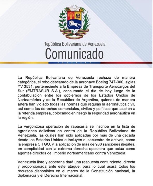 La República Bolivariana de Venezuela rechaza de manera categórica, el robo descarado de la aeronave Boeing 747-300, siglas YV 3531, perteneciente a la Empresa de Transporte Aerocargos del Sur (EMTRASUR S.A.), consumado el día de hoy luego de la confabulación entre los gobiernos de los Estados Unidos de Norteamérica y de la República de Argentina, quienes de manera artera han violado todas las normas que regulan la aeronáutica civil, así como los derechos comerciales, civiles y políticos que asisten a la referida empresa, colocando en riesgo la seguridad aeronáutica en la región.