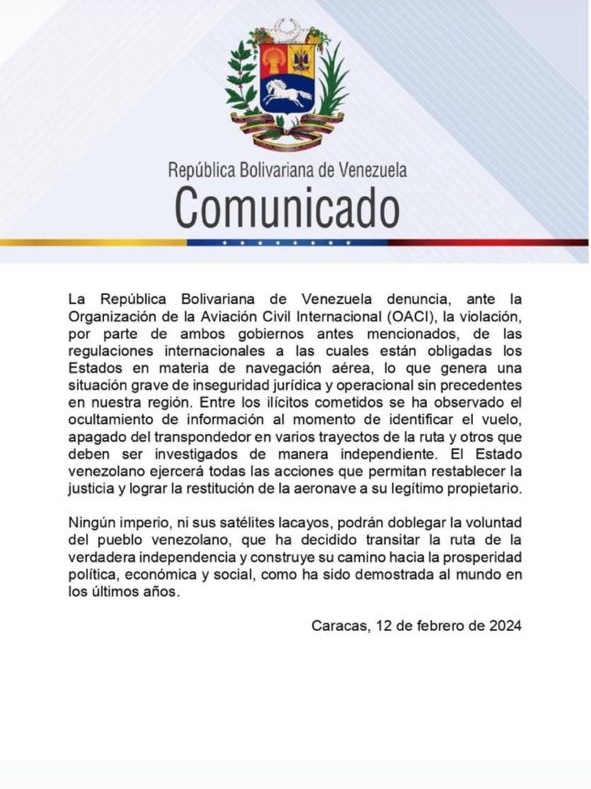 Mediante un comunicado —publicado por el ministro para Relaciones Exteriores, Yván Gil—, Venezuela acusó a ambos países de violar «todas las normas que regulan la aeronáutica civil, así como los derechos comerciales, civiles y políticos que asisten a la referida empresa, colocando en riesgo la seguridad aeronáutica en la región».