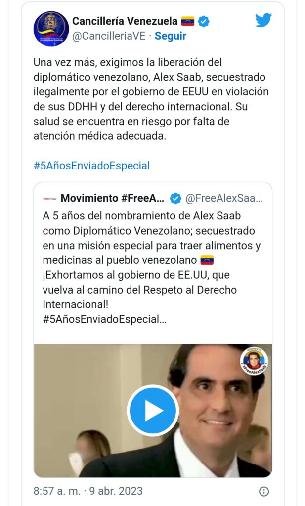 «Una vez más, exigimos la liberación del diplomático venezolano, Alex Saab, secuestrado ilegalmente por el Gobierno de EE. UU. en violación de sus Derechos Humanos (DD. HH.) y del Derecho Internacional», así lo dio a conocer la Cancillería de la República Bolivariana de Venezuela.