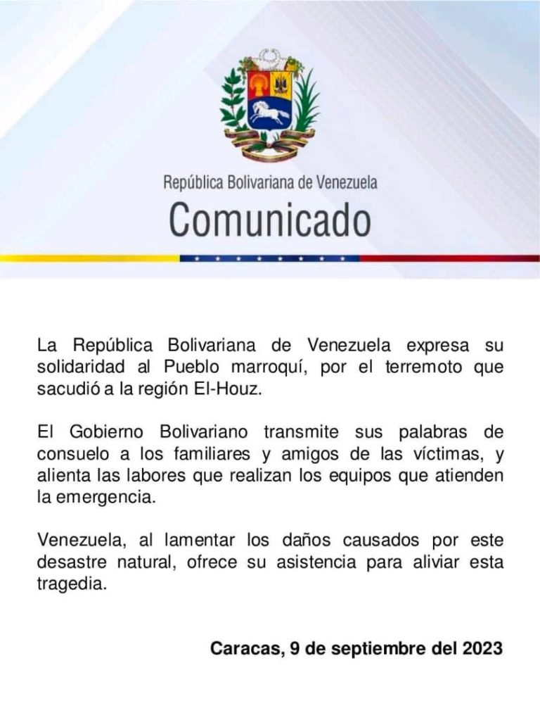 Luego del terremoto que afectó la región marroquí de El-Houz con una intensidad de 6,8 en la escala de Richter y que dejó más de 800 fallecidos, el Gobierno Bolivariano a través del canciller Yván Gil, en un comunicado oficial publicado en su perfil de la red social X (Twitter), expresó su solidaridad con el pueblo de Marruecos y ofreció la asistencia humanitaria necesaria para ayudar a aliviar la tragedia causada por este desastre natural.