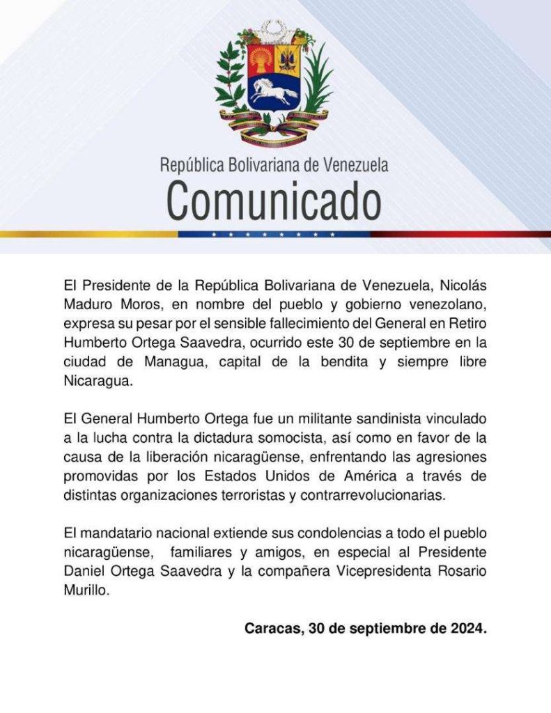 El Gobierno bolivariano de Venezuela lamentó este lunes el fallecimiento del general en retiro, Humberto Ortega Saavedra en Nicaragua, informó el canciller de la República, Yván Gi en un post en su canal de Telegram.