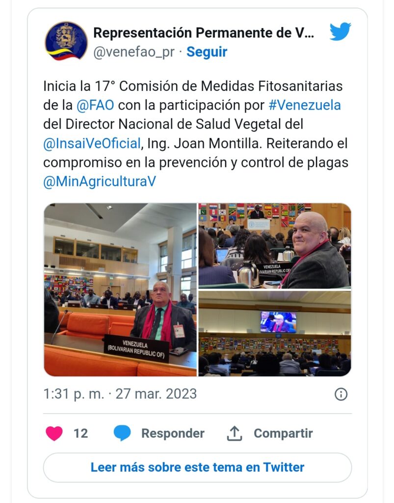 El director Nacional de Salud Vegetal del Instituto Nacional de Salud Agrícola Integral (Insai), Joan Montilla, participó en la 17º Comisión de Medidas Fitosanitarias de la Organización de las Naciones Unidas para la Alimentación y la Agricultura (FAO), con el objetivo de reiterar el compromiso en la prevención y control de plagas en Venezuela.