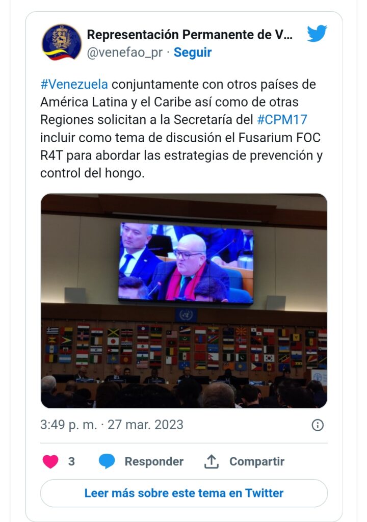 Asimismo, países de Latinoamérica y el Caribe en conjunto con Venezuela, solicitaron a la Secretaría de la Convención Internacional de Protección Fitosanitaria, incluir como tema de discusión de la enfermedad que afecta las plantaciones de cambur y plátano, denominada «Fusarium FOC R4T».