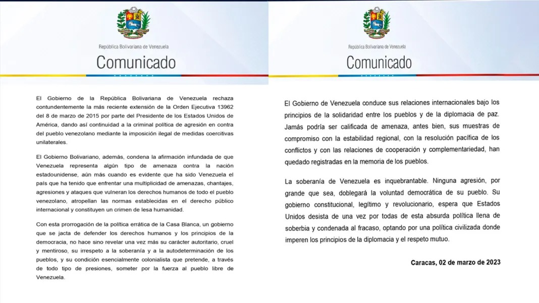 El gobierno del presidente Nicolás Maduro rechaza contundentemente la más reciente prorrogación por Estados Unidos, durante un año más, de la Orden Ejecutiva 13962 del 8 de marzo de 2015, según la cual Venezuela es una «amenaza inusual y extraordinaria para la seguridad nacional» de ese país del norte.