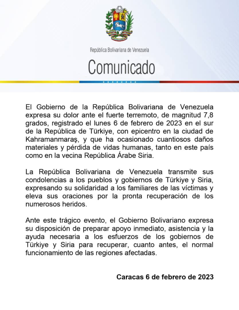“La República Bolivariana de Venezuela, transmite sus condolencias a los pueblos y gobiernos de Türkiye y Siria, expresando su solidaridad a los familiares de las víctimas y eleva sus oraciones por la pronta recuperación de los numerosos heridos”, remite la misiva publicada en la cuenta de la red social del canciller venezolano, @yvangil.