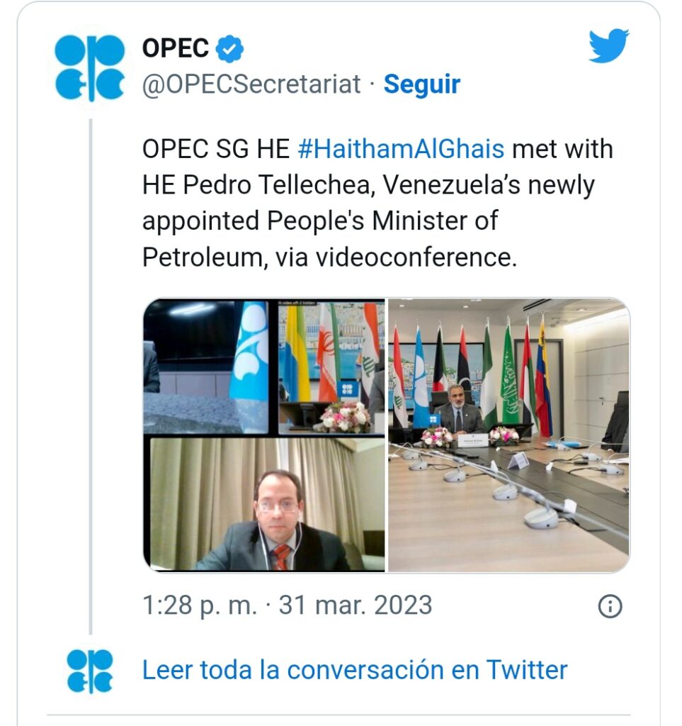 El ministro del Poder Popular para el Petróleo, Pedro Rafael Tellechea, sostuvo una reunión de trabajo, a través de una videoconferencia, con el secretario general de la Organización de Países Exportadores de Petróleo (OPEP), Haitham Al Ghais.