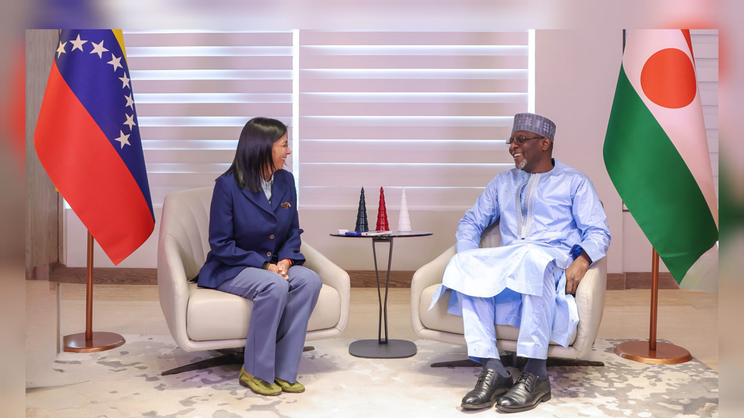 En una muestra del fortalecimiento de sus relaciones diplomáticas, la vicepresidenta de la República Bolivariana de Venezuela, Delcy Rodríguez, sostuvo este martes una reunión con el ministro de Asuntos Exteriores, Cooperación y Nigerinos en el Exterior de la República de Níger, Yaou Sangaré Bakary. Este encuentro se enmarca en la conmemoración del vigésimo aniversario del establecimiento de relaciones diplomáticas entre ambos países.