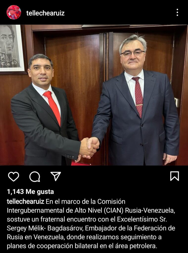 «En el marco de la Comisión Intergubernamental de Alto Nivel (CIAN), sostuve un fraternal encuentro con el excelentísimo señor Serguéi Mélik-Bagdasárov, embajador de Rusia en Venezuela, donde realizamos seguimiento a planes de cooperación bilateral en el área petrolera», señaló Tellechea en un mensaje publicado en Instagram, sin brindar mayores detalles.