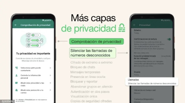 WhatsApp ha implementado dos nuevas funciones enfocadas en la seguridad y privacidad de los usuarios. La primera es la opción de silenciar las llamadas de desconocidos, para dar más control sobre las llamadas entrantes. La segunda, es la comprobación rápida de privacidad, para asegurar que se conocen las opciones de protección en la aplicación.