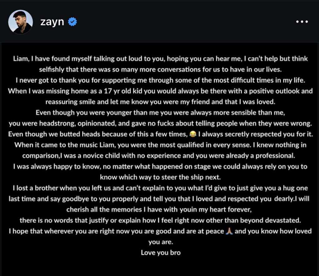 Zayn Malik, con quien compartió gran parte de su adolescencia al formar parte de la exitosa boy band, One Direction; emitió un desgarrador mensaje vía redes sociales para despedirse de su excolega y amigo.