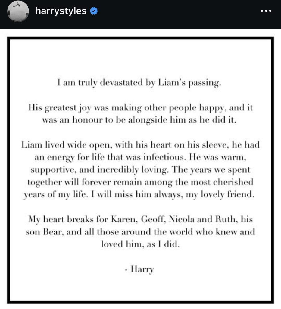 Para finalizar su mensaje, Styles compartió sus condolencias para la familia de Liam, amigos y fans: “Mi corazón se rompe por Karen, Geoff, Nicola y Ruth, su hijo Bear, y todos aquellos de todo el mundo que lo conocieron y lo amaron, como lo hice yo”.